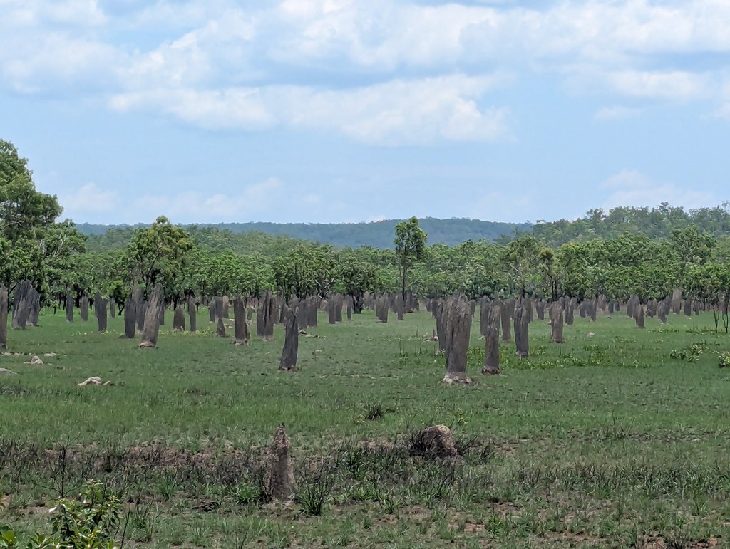 On arrival our first stop was to the Magnetic Termite Mounds including the famous Cathedral Termite Mound. The mounds are tall, narrow structures built by termites over many years, all facing the same direction. We found it fascinating to learn that the mounds are aligned north to south so the termites can control the temperature inside their nest. This position allows the narrow edge of the mound to face the intense midday sun, reducing heat, while the wider sides catch the gentler morning and afternoon sunlight. This helps keep the nest cool and protects the termites and their eggs.