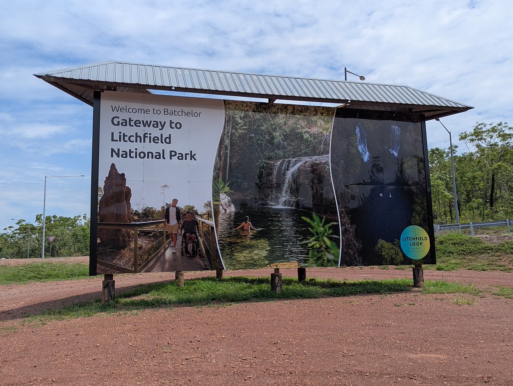 Our first stop was to the small town of Batchelor which is referred to as the gateway to Litchfield. On spotting the Lil’ Ripper Café, we parked outside and enjoyed our morning cups of coffee. Before leaving we enjoyed a chat with one of the locals who kindly took our photo in front of the cafe’s crocodile skin hanging outdoors.